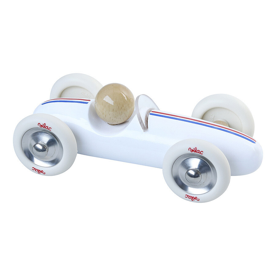 Cette superbe Voiture Grand Prix vintage MM blanche est un jouet en bois massif durable et écologique, adapté aux tout-petits, de 18 cm de long.